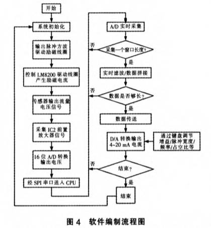 在編制礦用(yong)電磁流量計軟件(jian)的過程中,首先要(yao)求對系♻️統☎️進♊行👈初(chu)始化、再對CPU進行初(chū)始化,由CPU輸出勵磁(cí)脈沖方波☁️信号,控(kong)制🔞LM8200産生勵磁電流(liú)驅動勵磁線圈。采(cǎi)集傳感器信❓号,使(shǐ)傳感器送出反映(ying).流量大小的🙇🏻電壓(yā)信号,經過IC2前置💯放(fang)大器放大該信号(hào)🏃♂️,再經16位A/D轉換器和(he)SPI串口送人單片機(jī)進行處理,在🍉單片(pian)機中要進行A/D實時(shi)采集、實時濾波和(hé)數據拼接和數據(ju)傳送,最後經過D/A轉(zhuǎn)換後,經過IC4轉換成(chéng)4~20mA電流信号直接輸(shū)出或🔱者以電壓形(xing)式輸🔞出。