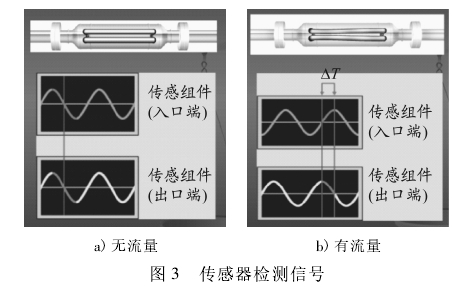 當U形管(guan)内無流體流過(guò)時,振動管不産(chan)生扭曲,振動管(guan)兩側電磁信号(hao)檢測器檢測到(dào)的信号是同相(xiang)位的,見圖3a;當U形(xíng)管内有流體流(liu)過時,振動管在(zài)力矩作用下産(chǎn)生扭曲,2個檢測(cè)💃器間将存在相(xiàng)位差,見圖3b。用變(biàn)送器測量左、右(you)檢測信号之🙇🏻間(jian)的滞後📧時間,将(jiāng)這☂️個時間差乘(chéng)以流量标定因(yīn)數,就可确定質(zhì)量流量💞。因此,質(zhi)量流量越大,扭(niu)曲越大,也即相(xiàng)位差越大。