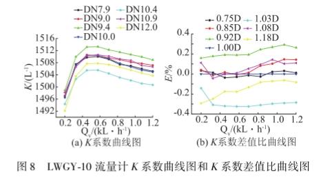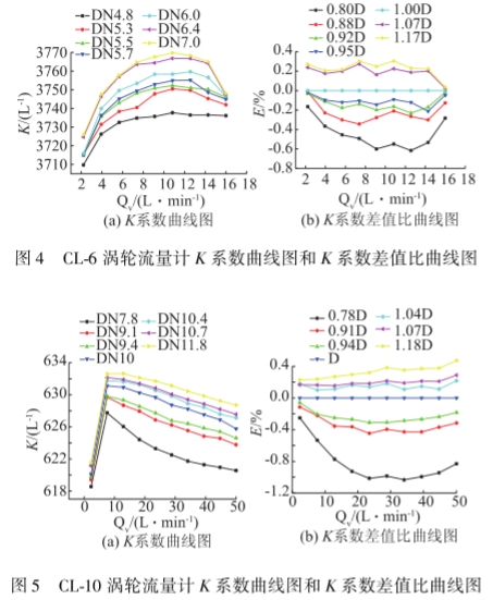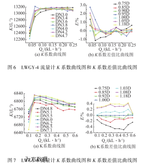 圖3圖5别爲(wèi)流量計的K系數曲(qu)線圖和無量綱化(huà)後的差值比曲線(xiàn)圖。