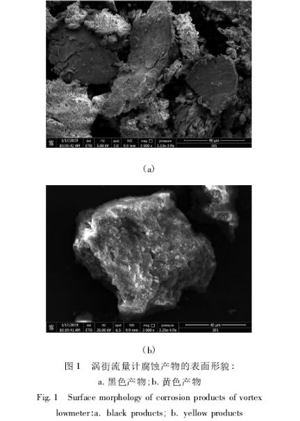渦街流量計(ji)在四氧化二氮加(jia)注系統中長期使(shǐ)用,其表面存在一(yī)定厚度且分布不(bú)均的黑色和黃色(sè)🏃♂️腐蝕産物,黑色腐(fu)蝕産物數量明顯(xiǎn)更多。爲了觀察腐(fǔ)蝕産☀️物的微觀表(biao)面形貌,将其從渦(wo)街流量計表面剝(bāo)離并進行SEM分析,其(qi)形貌如圖1所示。
