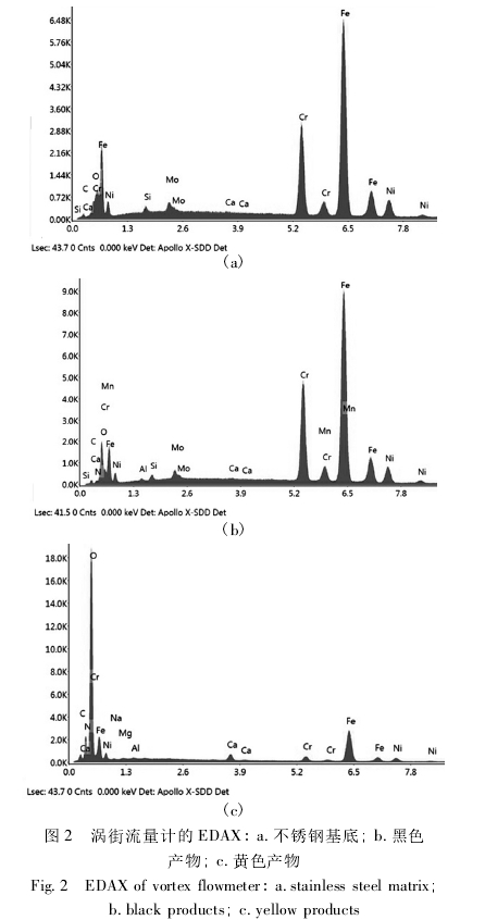 采用(yòng)FEI公司QUANTAFEG450型場發射掃(sǎo)描電子顯微鏡(SEM)觀(guān)察數字式渦街流(liú)量計⭐表面剝離的(de)黑色和黃色腐蝕(shi)産物的🌈表面💚形貌(mao)🌈,并用🛀其自♈帶的能(néng)譜分析儀(EDAX)分析腐(fu)蝕産物的元素組(zǔ)成🔞含量。測試條件(jian):測試電壓20kV,光斑尺(chǐ)寸6.00μm,工作距離✊10mm;采用(yong)PHI5000VersaprobeII射線電子能譜儀(yi)(XPS)分析腐蝕産物的(de)存在形态,試驗使(shi)用Al靶。