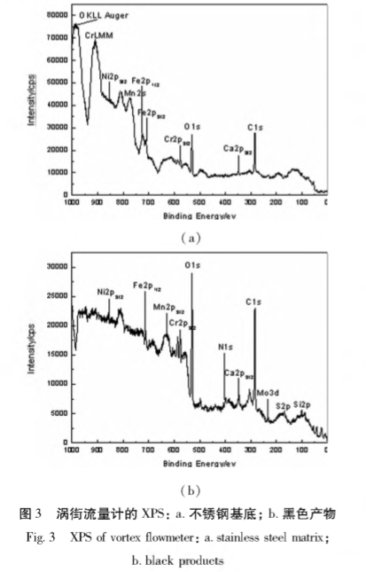 将渦街流(liú)量計的不鏽鋼基(jī)底和黑色腐蝕産(chǎn)物進行XPS分析,其測(cè)試結果如圖3所示(shì)。由圖3可見,不鏽鋼(gāng)基底含有C、Ca、O、Fe、Mn、Ni、Cr等元素(sù);黑色腐蝕産物含(hán)有Si、S、C、Ca、N、O、Cr、Fe、Mn、Ni等元素。N元素的(de)分析與EDAX分析結果(guo)一緻;Si、大量Fe單質和(he)少量Fe的氧化物形(xíng)式存在;黑色腐蝕(shi)🏃🏻♂️産物中Fe主要以Fe2O3形(xíng)式🥵存在。不鏽鋼基(jī)底和黑色腐蝕産(chǎn)物Cr2p3/2的電子結合能(neng)分别爲574.4eV和🆚576.7eV,與标準(zhun)圖譜Cr2p32中❌單質Cr的574.1eV和(hé)Cr2O3的576.6eV比較可知,不鏽(xiù)鋼基底中Cr元素主(zhǔ)要以單📱質Cr存在,黑(hēi)色腐蝕産物中Cr元(yuan)素以Cr203形式存在。同(tong)理分析,黑色腐蝕(shi)産物中💘Ni元素以Ni2O3形(xing)式存在。黑色腐蝕(shí)産物中NIs的電子結(jié)合能爲398.0eV,與NH.NO,的電子(zǐ)結合能398.5eV相對接近(jìn),故黑色🏒腐蝕産物(wù)中N元🧑🏽🤝🧑🏻素最可能⛷️以(yǐ)NO,形式存在。