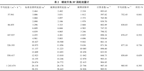 利用上述(shù)實驗方法,分别對(dui)安裝35°、45°和55°渦輪的流(liu)量計進🈲行了實驗(yan)💛檢定,表2列出了安(ān)裝35°葉片螺旋升角(jiao)表渦輪🔱流量💃計的(de)檢定數據,平均流(liu)量是随機設定标(biao)準吸風裝置的輸(shu)出流量,平均系數(shu)和誤差按公式👈(3)和(he)(4)計算。