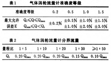 氣體(ti)渦輪流(liú)量計的(de)精度等(deng)級見表(biǎo)1、表2。
