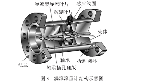 結構示意(yì)圖,該流量計(jì)屬于速度式(shi)流量計,主要(yào)包括感應線(xiàn)🤩圈、渦輪葉片(pian)、倒流架導流(liú)葉片、管道殼(ke)體等部件。