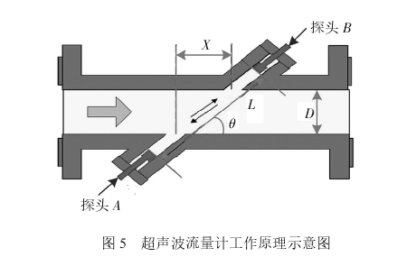 是通過檢測(ce)流體流動對(dui)超聲脈沖的(de)作用來測量(liàng)流♈量的一種(zhong)非接觸式流(liú)量計。圖5所示(shi)爲采用時差(cha)♻️法測量原理(lǐ)的🈚超聲波流(liú)量計,當超聲(sheng)波在成品油(you)💞長輸管道中(zhong)傳輸時,探頭(tou)A與探頭B分别(bie)檢測接收對(duì)📧方發射的✨超(chao)聲波脈沖,由(yóu)于順流方向(xiàng)聲波傳播速(su)♋度大于逆流(liú)方向聲波傳(chuán)播速度,則相(xiàng)同傳播距離(li)下就會得到(dào)🌈不同的傳播(bo)時間,利用傳(chuán)播時間之差(cha)即可計算原(yuan)油的流速與(yǔ)流量,計算公(gong)式如下: