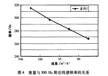 選(xuǎn)擇300Hz頻率對應的(de)方框,研究方框(kuàng)内各線譜頻率(lǜ)與流量的對應(yīng)關系,從圖3可看(kàn)出,流量改變與(yu)300Hz附近線譜頻率(lǜ)變化基本成正(zheng)比關系,由于渦(wo)輪流量計流動(dong)噪聲的線譜頻(pín)率與式(1)中的電(diàn)脈沖頻率成正(zhèng)比,流量與頻率(lü)之間的❓關系對(duì)應式(1)的描述。