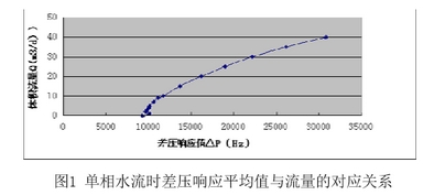 固定節(jiē)流孔(即(jí)出液孔(kǒng))寬度爲(wèi)5mm,在單相(xiang)水流時(shí),打開集(ji)流器集(ji)流,差壓(yā)傳感器(qi)的響應(ying)值與流(liú)量的對(dui)應關系(xì)如圖1所(suo)示。
