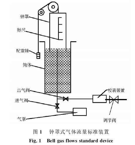 轉子流(liu)量計的(de)檢定标(biāo)準是根(gen)據JJG257-2007轉子(zǐ)流量計(ji)檢定規(gui)程而進(jìn)行的LI,檢(jian)定時采(cǎi)用鍾罩(zhào)式氣體(ti)流量标(biāo)準裝置(zhì).鍾罩式(shi)氣體流(liú)量标準(zhǔn)裝置如(rú)圖1所示(shi)8-41.圖中的(de)鍾罩是(shì)一個上(shang)部有頂(ding)蓋,下部(bu)開口的(de)容器,筒(tong)體内盛(shèng)滿水或(huo)者不易(yi)揮發的(de)油.由于(yú)液封的(de)😄作用,使(shǐ)得鍾罩(zhao)成爲一(yi)🔞個密封(fēng)的容器(qi).進氣閥(fa)上的導(dao)管插入(rù)⁉️鍾罩内(nei),頂端露(lu)出液面(mian),其高度(du)以鍾罩(zhào)下降到(dao)最低點(diǎn)時不碰(peng)到鍾罩(zhào)頂蓋爲(wèi)宜.爲了(le)避免鍾(zhōng)罩下降(jiang)時晃🍉動(dong),通過導(dao)輪、定滑(huá)輪及配(pei)重錘來(lái)調節鍾(zhōng)罩内的(de)🐇壓力.檢(jian)定玻璃(li)轉子流(liú)✌️量計的(de)工作原(yuán)理是首(shǒu)先打開(kāi)進氣閥(fa)門,關閉(bì)出氣閥(fá)🧑🏾🤝🧑🏼,開動氣(qi)泵使氣(qì)🍉體通過(guò)導🆚管流(liu)入氣體(tǐ)流量标(biāo)準裝✔️置(zhì)⛹🏻♀️的工作(zuo)量器内(nei).當鍾罩(zhào)上升到(dao)最高位(wei)置時,關(guān)閉氣泵(beng),停一段(duàn)時間後(hòu),待标準(zhǔn)容器内(nei)⛹🏻♀️氣體的(de)溫度穩(wen)定時,開(kāi)始檢定(ding)流量計(ji).鍾罩式(shì)氣體流(liu)量标準(zhǔn)☔裝置本(ben)身是一(yī)個恒壓(ya)源并㊙️給(gei)出标準(zhǔn)容積的(de)裝置.打(dǎ)開出氣(qì)閥和調(diao)節閥,鍾(zhong)罩以一(yī)定的速(sù)度下降(jiang).此時開(kāi)🙇🏻始計時(shí),流量計(ji)🌈開始計(ji)數,測出(chū)鍾罩排(pai)出的氣(qi)體體積(ji)、溫度和(he)時間,鍾(zhōng)罩内的(de)氣體通(tōng)過導氣(qì)管經被(bei)檢定的(de)流量計(jì)流入大(da)氣,計算(suan)出流量(liàng)計在刻(kè)度狀态(tai)下的實(shí)際流量(liang)和示值(zhi)誤差.實(shi)際流量(liang)值可根(gen)據公式(shì)(1)計算得(de)出: