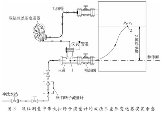 煤氣(qì)化裝置中(zhōng)液體吹掃(sǎo)的典型應(ying)用是差壓(ya)法測量氣(qi)化爐激冷(lěng)室液位。由(you)于氣化爐(lú)激冷室内(nei)的激冷水(shuǐ)爲複雜混(hùn)合物💜,既含(han)🈚有易堵塞(sāi)的固體顆(kē)粒.物,也含(han)有腐蝕性(xìng)成分,因☂️此(cǐ)一般🏃🏻♂️采用(yòng)雙法蘭差(cha)壓變送器(qi)進行測量(liang)。變送器負(fu)壓側法蘭(lán)隔膜與激(jī)冷室㊙️内的(de)氣相接🐉觸(chu),無需吹掃(sǎo),而變送器(qì)正🈲壓側法(fǎ)蘭隔膜則(zé)與激冷水(shui)接觸,必須(xu)引入沖洗(xi)水以防止(zhi)取壓口堵(dǔ)塞影👣響液(ye)位🛀🏻測量,并(bìng)延長變送(song)👣器的壽命(mìng)。帶吹掃轉(zhuǎn)子流量計(jì)的雙法蘭(lan)差壓變送(song)器安裝如(ru)圖3所示。