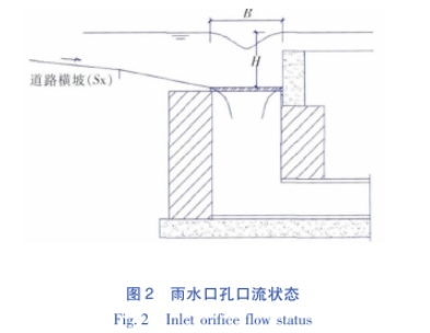 當(dang)雨水流量增加(jiā)、雨水口算前水(shuǐ)深(H)較深時,雨水(shui)逐漸淹沒整個(ge)雨水口算,轉變(bian)成以孔口流形(xíng)式流人雨水口(kou),如圖2所示。