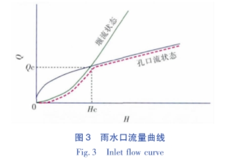 雨水口(kǒu)流量曲線見圖(tu)3。如圖3所示,綠色(se)爲堰流狀态的(de)流量曲線,藍色(sè)爲孔口流狀态(tai)的流量曲線。而(ér)圖中紅色虛線(xiàn)所示,即爲雨水(shui)口的實際流量(liàng)特性。在箅前水(shui)深較小時,表現(xiàn)爲堰流狀态;在(zai)算前水深較大(da)時,表現爲孔口(kou)流狀态。而當箅(bi)前水深爲臨界(jiè)深度He時,堰流狀(zhuàng)态與孔口流狀(zhuang)态的計算流量(liang)相同,均爲Qc.
