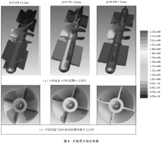 (2) 随着流(liu)量增加,葉輪、導(dao)流架上遊面形(xíng)成的靜壓變高(gao),葉片上遊面和(he)葉片下遊面的(de)壓力随着流量(liang)的增加.而減小(xiǎo)。