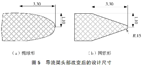基于上述CFD仿真(zhen)分析結果,爲有(you)效減小葉輪壓(ya)力.損😘失,将原導(dao)😄流架頭部的球(qiú)形分别設計橢(tuǒ)球型和圓錐形(xíng),改進後的導流(liú)架頭部尺寸如(ru)圖5所示。
