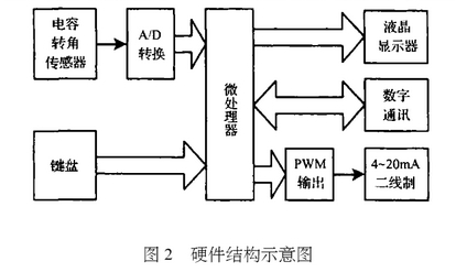 硬件(jian)結構如圖2所示(shi),浮子的位置變(biàn)化通過擺杆變(bian)爲角度變化後(hou),由電容角位移(yi)傳感器轉換爲(wei)電壓信号,微處(chù)理器通過内部(bu)集成的A/D轉換器(qi)将該信号變爲(wèi)數字量進行流(liú)量計算并累計(jì),将計算結果送(song)液晶顯示器顯(xian)示,并通過控制(zhi)PWM輸出,将當前瞬(shùn)時流量以4~20mA二線(xiàn)制方式遠傳;鍵(jian)盤用于外部參(can)數設置;數字通(tōng)訊接口與計算(suàn)機連接進行内(nèi)部參數設置。