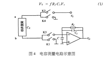 電容(róng)測量電路基于(yu)充放電原理,該(gai)電路具有抗寄(jì)生電容、雜散電(diàn)容等分布電容(róng)特性。圖4爲電容(rong)測量電路示意(yì)圖,Vc爲充電電壓(yā),開關K1、K2、K3、K4受時鍾脈(mo)沖控制。一個完(wán)整的測量過程(chéng)包括充放電兩(liang)個周期:K1與K2導通(tong),K3與K4關斷爲充電(diàn)狀态,将被測電(dian)容G充電到Vc;K1與K2關(guān)斷,K3與K4導通爲放(fàng)電狀态,被測電(diàn)容中的電荷由(you)電荷檢測器檢(jiǎn)出,輸出正比于(yú)被測電容的電(dian)壓信号V0