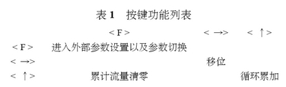AD轉換器采集(ji)角位移傳感器(qi)輸出電壓信号(hao),采集時間間隔(gé)爲10ms,采集的電壓(yā)值經數字濾波(bo)後,用于流量計(ji)算;鍵盤處理模(mo)塊采用中斷方(fāng)式,根據鍵值,實(shí)現表1所示功能(neng)。