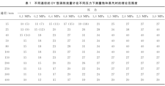 渦(wo)街流量計具有範(fàn)圍度寬的特點。在(zai)用于測量蒸汽流(liu)量時,一些制造廠(chang)商宣傳的範圍度(du)可以做到40倍.但對(duì)其所提供的資料(liao)進行具體分析時(shí),也隻有一部分中(zhōng)小通徑的儀表,在(zai)流體壓力較高時(shí),理論範圍度能夠(gòu)達到40倍0],而作爲關(guān)口蒸汽計量使用(yòng)的大通徑儀表,範(fan)圍度要小得多。例(lì)如DY300型DN300渦街流量計(jì),在用來測量表壓(ya)爲p=1.0MPa的飽和蒸汽時(shi).理論範圍度爲24倍(bèi)。不同通徑的DY型渦(wo)街流量計,在不同(tóng)壓力條件下測量(liàng)飽和蒸汽時的理(li)論範圍度見表1所(suǒ)列。