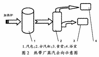 熱帶廠(chang)目前使用的蒸(zheng)汽主要由加熱(re)爐爐内管道🌈汽(qi)化👌産生,蒸汽過(guo)渡儲存在汽包(bāo)中。設計要求汽(qì)包💚工作壓力爲(wèi)0.50~0.80MPa,正㊙️常工作壓力(lì)爲0.70MPa左右。汽包産(chǎn)生的蒸汽流量(liàng)爲3.0t/h。蒸汽通過DN100的(de)管道輸送,蒸汽(qì)終端用戶爲食(shí)堂和浴室,蒸汽(qì)主要用于加熱(re)。圖2對熱🏃帶廠的(de)蒸汽去向作了(le)簡單的說明。.