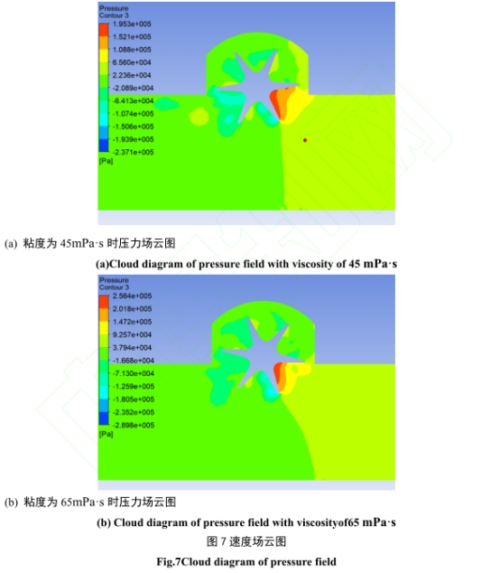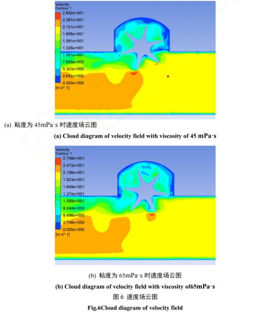 能夠發現(xian)在相同條件下(xia),粘度65mPa·s下的葉輪(lun)附近最大速度(dù)爲27.5m/s,略高㊙️于粘度(du)45mPas下的26.5m/s,粘度的升(sheng)高導緻了流場(chang)流速的整🚶體升(shēng)高。分析其原因(yīn)爲粘度的升高(gao)使葉輪頂隙☁️流(liú)體粘性阻力增(zeng)大,減小了間隙(xì)中的流體📞流量(liang),從而使葉片表(biao)面流量增加,導(dao)緻葉輪轉速小(xiǎo)幅上升。