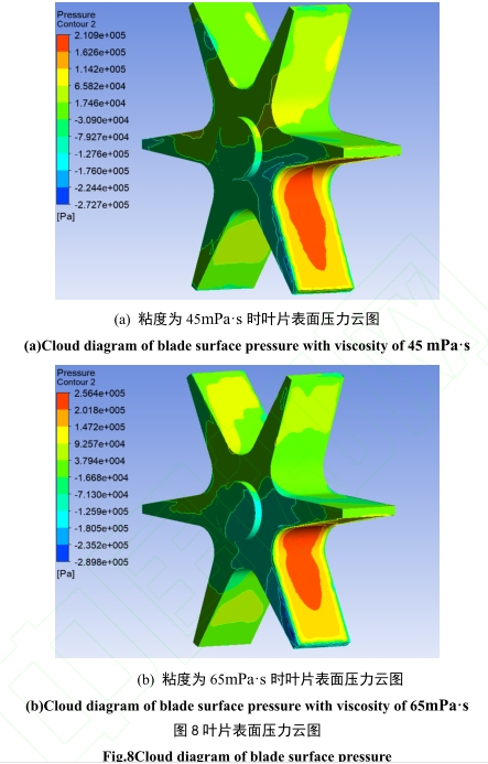 通過圖7所(suo)示的流量計的(de)截面壓力雲圖(tu)可知,渦輪流量(liang)🔴計正🔞常㊙️作業時(shi),整個腔體内的(de)壓力分布較爲(wèi)較爲均勻,壓力(li)場變化較大的(de)地方發生在葉(yè)輪葉片與流體(ti)發生沖擊的--側(ce),最大壓力集中(zhong)在葉片表面附(fu)近,粘💛度65mPa·s.條件下(xià),葉輪表面處的(de)最大壓力達到(dao)🛀0.256MPa,高于粘度45mPa·s條☎️件(jian)下的0.195MPa,壓力從葉(yè)片表面向外逐(zhu)漸較小。流體粘(zhan)度的🙇♀️升高使葉(ye)輪附近流體阻(zu)力矩增大,導緻(zhi)作用♊在葉片表(biao)面的推動力增(zēng)大,從而葉片受(shou)🆚到☎️的壓力增大(dà)。