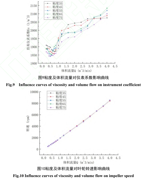 圖10爲葉輪轉速(su)随體積流量的(de)變化關系圖,發(fa)現葉輪轉速和(hé)體積流量呈正(zhèng)比例增大關系(xi),受粘度變化影(yǐng)響較小。