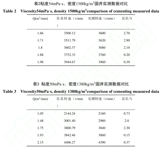 将實際固(gù)井作業中采集(ji)到的兩組葉輪(lun)轉速數據🧑🏾🤝🧑🏼和仿(pang)真結果🍉進行對(duì)比,最大誤差爲(wèi)2.9%,最小誤差0.2%,平均(jun)誤差1.38%,仿真數據(jù)和實🏃測數據較(jiào)爲接近,認爲所(suǒ)建立的仿真模(mo)型具有精度。