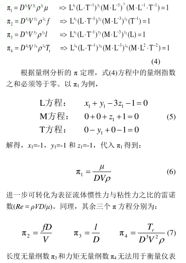 七個選定的變(biàn)量中流速V、流量計(jì)的尺寸D和l決定了(le)儀表本身👄的🏃♂️性能(neng)。流體物性p、μ和阻力(lì)矩T;影響儀表的實(shí)際性能☔。七個✂️變量(liàng)包含☁️三個量綱單(dān)位(L、M和T),故選擇三個(gè)變量(D、V和p)作爲基本(běn)變量。四個π方程(7個(ge)變量-3個量綱單位(wèi)=4個方程)如式(4)所示(shì)。