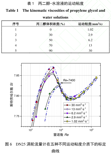首先在運動粘度(dù)v=2.9mm2/s下标定該流量計(ji),按體積流量設定(ding)12個檢🐆測✌️點,所以每(měi)一點的雷諾數與(yu)出廠标定時雷諾(nuò)數有一-定偏差(小(xiǎo)于7%)。标定結果與流(liu)量計的出廠數據(jù)對比如圖5所示☂️,當(dāng)雷諾數小于8000,兩者(zhe)的偏差📞大于0.6%,最大(dà)偏差爲1%;當雷諾數(shu)大于8000,兩者的偏差(cha)在0.1%以内。實驗結果(guo)表明,在流量計量(liang)程的低❗區,即使使(shǐ)用粘度較低的介(jiè)質,.出廠标定數據(ju)和實測結果☔的差(cha)異仍然較☔大。根據(ju)校準實驗室的工(gong)作需求,配置了五(wu)種不同粘度的丙(bing)二醇-水.溶液(物理(lǐ)性質如表1所示,實(shi)驗室🔞環境溫度(21~23)°C),重(zhong)新标定流量計後(hou),結果分别✔️繪制成(cheng)Re-St曲線(如圖6所示)。不(bu)同粘度的标定曲(qǔ)線簇以Re=7400爲界呈現(xiàn)出分散和聚攏兩(liang)種特征,在聚攏區(qū)域,相同雷諾數下(xià),不同粘度的标定(ding)數據兩兩之間的(de)差異小于0.1%;而❗在分(fen)散區域,最大相差(cha)達到0.9%。由📐圖3可知,在(zai)低雷諾數區域⭐,斯(sī)特♌勞哈爾數随着(zhe)雷諾數減小急劇(jù)下降,那麽,不同粘(zhan)度的标定數據差(chà)異會越來越大。以(yǐ)下将結合渦輪流(liú)量計物理模型分(fèn)析上述特征。