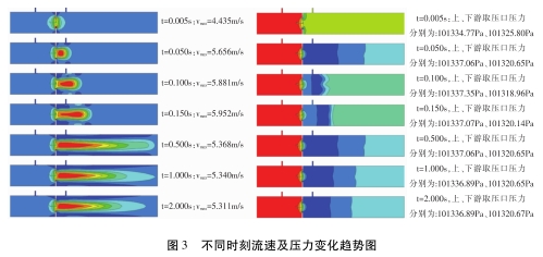 瞬态分(fèn)析如圖3所(suo)示,以了解(jie)孔闆流量(liang)計在進行(háng)工🏒作🧑🏾🤝🧑🏼時,介(jie)質的流動(dòng)狀态及壓(yā)力、速度實(shí)時分别情(qing)況。設定進(jìn)口✌️流量爲(wei)100m³/h,出口壓力(li)條件爲标(biāo)準大氣壓(ya)、溫度爲20℃;孔(kong)🔱闆流量計(jì)的結構設(shè)計造成氣(qi)🌈流通道變(bian)窄(管道突(tu)然變徑),氣(qì)流進入管(guǎn)道短時間(jian)(0.005s)内上遊取(qu)壓口壓力(li)突然增大(da),空氣流動(dong)加劇,下遊(you)管道壓力(li)突然間變(bian)小形成負(fù)壓區,但壓(yā)力🆚分布不(bú)明顯,僅🛀🏻在(zai)孔闆口周(zhou)圍形成不(bú)同壓力分(fen)層;下遊管(guǎn)道壓力出(chū)現明顯分(fen)層、且逐漸(jiàn)趨于穩定(ding)。