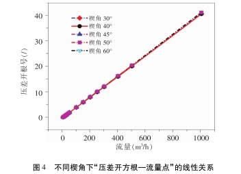 根據2.1參(can)數設計,建(jiàn)立模型,其(qí)他條件不(bu)變,隻改變(bian)楔角的大(dà)小,分别取(qu)φ爲30°、40°.45°、50°、60°條件下(xia)k系數的變(biàn)化規律;仿(páng)真流程如(rú)3.1所述。得到(dào)結果如圖(tú)4所示,不同(tóng)楔角下,“壓(ya)差✨開方根(gēn)-流量點”均(jun)呈理想線(xian)性👣關系(R2=1),圖(tu)像幾乎是(shi)重合的,說(shuo)明楔角對(dui)h系數影響(xiang)較🌈小;線性(xing)關✊系分别(bie)爲: