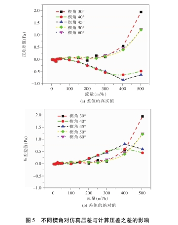 不難(nán)發現:整體(tǐ)來看,不論(lun)楔角是哪(na)一種情況(kuang),在50m³/h以内的(de)流量下,差(cha)值基本--緻(zhi),且均接近(jìn)于0;随着流(liú)量的逐漸(jian)增大,壓差(cha)差值呈增(zēng)大的趨勢(shì);楔角40°和楔(xiē)角45°條件下(xia),差🙇♀️值變化(hua)⛹🏻♀️趨勢基✊本(ben)緻,且偏離(lí)方向一緻(zhi);楔角50°與楔(xie)角60°條件下(xia),差值基本(běn)重合,且偏(piān)離方向一(yi)緻;楔♍角30°對(duì)差值的影(ying)響最大,在(zài)流量爲500m³/h時(shi),達📧到最大(dà)值1.94Pa。流🌈量400m³/h是(shì)差值的🏃♀️“拐(guai)點”,當楔角(jiǎo)爲40°、45°時,差值(zhí)最大,之後(hou)差值🎯開始(shǐ)降低;當楔(xiē)角爲30°、50°、60°時,差(chà)值開始突(tū)然變大。