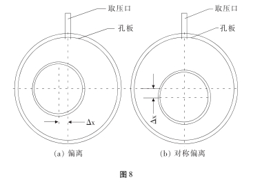 本文(wen)孔闆對中(zhōng)性是指在(zài)安裝孔闆(pan)或實驗室(shì)檢定孔闆(pan)♍時,孔闆孔(kǒng)口的中心(xin)線與管道(dao)中心線--緻(zhi)程度⭕,将上(shàng)述中心線(xiàn)的偏離距(jù)離作爲試(shi)驗因子;如(rú)圖8所示,偏(piān)離分爲對(dui)稱偏離(DCPL)和(hé)偏離(PL)兩種(zhong);分别取偏(piān)離距🌈離△x爲(wei)5mm、10mm、15mm.20mm,楔角爲45°,介(jie)質爲🚶空氣(qi)進行♈仿真(zhen)實驗等。