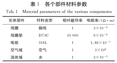 有限元網(wǎng)格的質量直接影(ying)響計算精度,采用(yong)自動網格劃分,單(dān)元形狀爲四面體(ti),粗網格和細網格(ge)之間過渡并不光(guāng)滑,因此将流體域(yù)和空氣域之間的(de)測量管域的網格(ge)單元大小設置爲(wei)2mm。網格劃分後,導入(rù)Anrsys中進行單元類型(xíng)、材料、實常數、載荷(he)、邊界條件和場路(lù)耦合單元設置。線(xian)圈用銅線實現,匝(zā)數共6500匝,其截面積(jī)爲2.72×10-4:mm²,體積爲1.49×10-5mm3;線圈坐(zuò)标系單獨定義爲(wei)局部柱坐标系,軸(zhou)向爲正Y方向,其餘(yú)部件的坐标系使(shi)用全局笛卡爾坐(zuo)标系,軸向爲正Y方(fāng)向。各個部件的材(cai)料參數設置見表(biǎo)1。