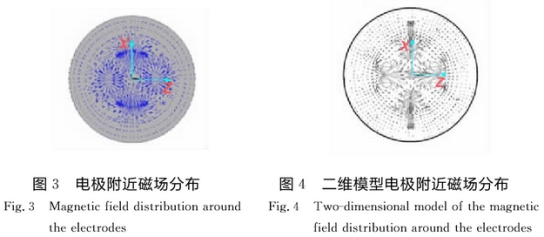 爲了保證模型(xíng)的正确率,對建立(lì)的四電極外流式(shi)電磁流量傳感器(qì)的三維有限元模(mo)型,從2個方面進行(hang)了校驗:首先,給有(you)限元模型施加恒(héng)值電流激勵,選用(yong)靜态求解類型,将(jiang)模型最外圈節點(diǎn)的Ax,Ay,Ax自由度均設爲(wei)0,選擇所有單元後(hou)進行求解,然後在(zai)後處理器中讀入(rù)結果,畫出電極附(fu)近的磁場;分布,如(ru)圖3所示,磁場分布(bu)符合金甯德等數(shu)值分析的結果'5],如(ru)圖4所示;其次,在現(xiàn)有模型基礎上加(jiā)密網格單元,所得(dé)感應電動勢大小(xiǎo)前後誤差小于5%,從(cóng)而保證有限元計(jì)算結果不受網格(ge)質量變化的影響(xiang)。綜上所述,該有限(xiàn)元模型是準确的(de),可用來進行仿真(zhen)研究。