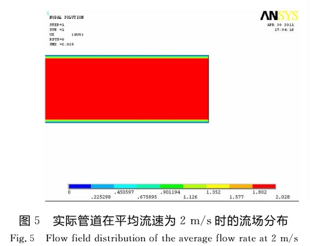 因此(cǐ),當管道内平均流(liú)速V>0.092m/s時,管道内的流(liu)動狀态爲紊流;事(shì)實上,四電極外流(liú)式電磁流量計在(zài)工作的時候,管道(dao)内大多數的流動(dòng)速度都大于這個(gè)值。當管道内的流(liú)動狀态爲紊流時(shí),用CFD軟件進行流場(chǎng)分析、計算,通過CFD模(mo)拟,可以分析并且(qiě)顯示流體流動過(guò)程中發生的現象(xiang),及時預測流體在(zài)模拟區域的流動(dong)性能[10],用有限元軟(ruan)件Ansys中的FLOTRANCFD模塊對其(qí)流場進行仿真分(fen)析,計算結果如圖(tú)5所示。