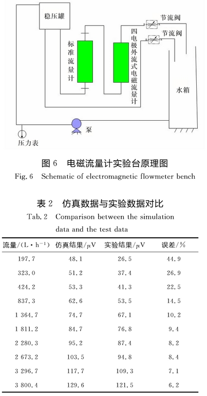 在紊流場共選定(dìng)了10個不同的流量(liang)值,獨立電壓源編(bian)程爲兩值矩形波(bo),幅值爲15V,頻率爲1Hz,對(dui)流量數據進行了(le)仿真計算,并在實(shí)驗台上得出了實(shí)驗數據,實驗台采(cǎi)用精度爲0.5%的電磁(ci)流量計讀取流量(liàng)值,用信号處理電(diàn)路采集四電極外(wài)流式電磁流量計(ji)的感應電動勢信(xin)号,通過串口輸入(rù)到計算機顯示,實(shí)驗台原理圖如圖(tú)6所示,最後對這2種(zhǒng)數據進行了誤差(chà)分析,結果見表2。