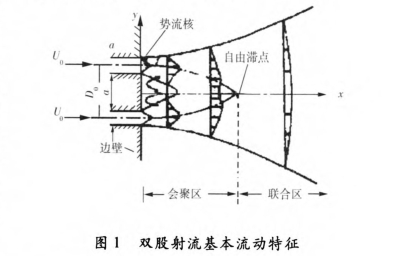 由文獻[4~8]可知(zhī),雙股射流按(an)其流動特性(xing)可分爲會聚(ju)🚶♀️區和聯🌂合區(qu),如圖1所示。由(yóu)于兩股射流(liu)的卷吸和幹(gàn)擾,以緻在兩(liǎng)股✂️射流‼️的彙(hui)聚區内形成(cheng)負壓區,在該(gāi)區内存在一(yī)對穩定的旋(xuan)轉方向相反(fan)的旋渦,旋渦(wō)的長度随着(zhe)孔間間🈲距的(de)增大而增長(zhǎng)[6]。在🔞兩股射流(liú)聯合後下遊(yóu)附近速度由(yóu)會聚區内的(de)負值變爲正(zheng)🌐值,預期存在(zai)一個點,在該(gai)點的.速度爲(wei)零,這個點稱(cheng)爲自由滯✔️點(diǎn)或混合點95),通(tōng)🔴過确定該點(dian)的位置可以(yǐ)反映出會聚(jù)區内旋渦的(de)長度。射流的(de)出射速度越(yue)大,對周圍流(liu)體的卷吸作(zuo)用越💋強烈,射(she)流之間🔞的旋(xuán)✨渦也越強烈(lie),因此多股射(she)流流場中會(huì)有⭐射流運動(dong)🐇方向偏轉的(de)現象發生(8]參(cān)考💔雙股射流(liu)的流動特征(zhēng)對多孔孔闆(pǎn)的流場進行(hang)🈚了區域劃分(fen),如圖2所示。