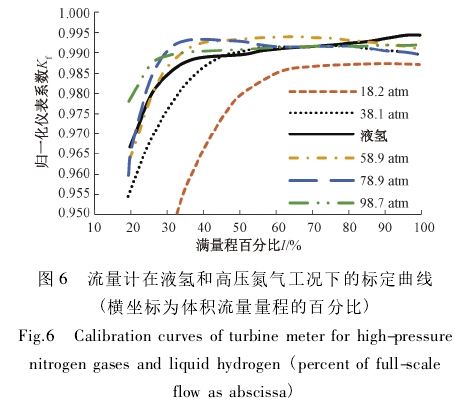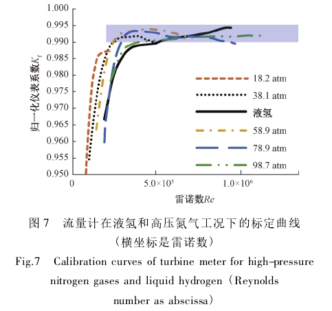 各(gè)個工況下的(de)标定曲線如(ru)圖6所示,試驗(yàn)結果用儀表(biao)系數K,表示,原(yuan)技術報告是(shi)以水标定的(de)儀表系數作(zuo)爲參照,經歸(gui)--化處理後作(zuo)爲縱坐标,橫(héng)坐标是體積(jī)流量量程的(de)百分比,爲方(fang)便分析,将标(biao)定數據轉爲(wei)圖7所示(橫坐(zuo)标以雷諾數(shu)表示)。物性方(fāng)面,58.9和78.9atm的高壓(ya)氮氣分别與(yu)液氫的密度(du)和運動粘度(dù)很接近,所以(yi)标定結果對(dui)比符合流動(dong)相似準則的(de)要求。6組标定(dìng)數據在量程(chéng)的低區(<50%FS,Re<5x10')差異(yì)較大,标定曲(qǔ)線呈現出“扇(shàn)形”特征,随着(zhe)雷諾數上升(sheng),差異逐漸減(jiǎn)小“扇形”趨于(yu)收斂。4個高壓(yā)氮氣(工況壓(yā)力≥38.1atm)以及液氫(qing)的标定數據(jù)在量程的高(gāo)區很接近,5條(tiao)标定曲線聚(ju)合于一個0.5%的(de)區間(如圖7中(zhōng)帶狀部分所(suo)示)。如果以該(gai)區間作爲僅(jǐn)與雷諾數相(xiàng)關的聚合域(yù),4條高壓氮氣(qi)标定曲線随(suí)着壓力的上(shang)升,依次進入(rù)該區間,正如(rú)前文的分析(xī),工況壓力越(yuè)高,進入聚合(he)域所對應的(de)雷諾數也越(yuè)大。