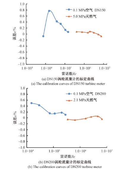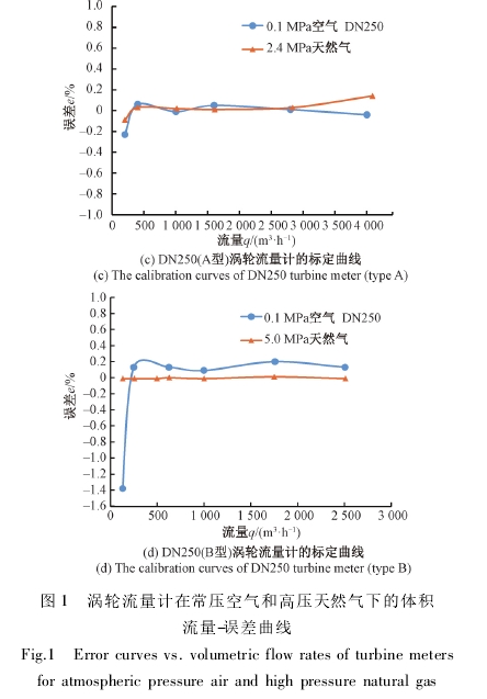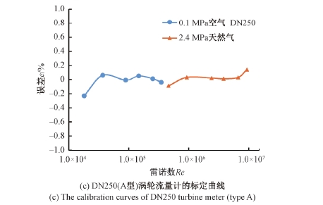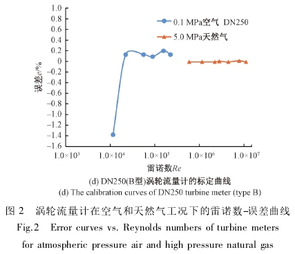 圖2所示爲。上(shang)述渦輪流量(liang)計基于雷諾(nuò)數(Reynoldsnumber,Re)的誤差對(duì)比。由于渦輪(lún)流量計一般(ban)是以體積流(liú)量标稱其量(liàng)程範圍,轉化(hua)到雷諾數後(hou),常壓下雷諾(nuo)數量程與高(gāo)壓下雷諾數(shu)量程存在間(jian)隔,兩個工況(kuàng)壓力相差越(yue)小,間隔區間(jiān)越小,常壓雷(lei)諾數上限的(de)誤差與高壓(ya)雷諾數下限(xiàn)的誤差越接(jiē)近,圖2(b)與圖2(c)中(zhōng)兩者相差分(fen)别爲0.24%和0.05%,可以(yǐ)認爲流量計(jì)的誤差幾乎(hū)随雷諾數連(lian)續變化。圖2中(zhōng)兩條誤差曲(qǔ)線沒有重疊(die)或交集,意味(wei)着流量計分(fèn)别工作在不(bu)同的流動特(te)征區域,無法(fa)進行常壓空(kōng)氣與高壓天(tiān)然氣之間的(de)點對點誤差(chà)對比。因此,需(xū)要增加高壓(yā)空氣下的标(biāo)定實驗。