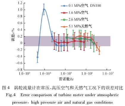 4個工(gōng)況下的标定(ding)結果如圖4所(suo)示,誤差棒用(yong)各個裝置的(de)相對測量不(bu)确定度表示(shì)。0.1MPa常壓空氣的(de)上限雷諾數(shù)和2.6MPa高壓空氣(qì)的下限雷諾(nuò)數比較接近(jin),各自對應的(de)誤差相差0.24%。4個(gè)壓力工況(0.1.1.6、2.6和(hé)5.1MPa)下的标定曲(qu)線包含3段明(míng)顯的雷諾數(shu)重疊區域,區(qū)域内兩兩曲(qu)線之間的差(chà)異小于0.2%,而且(qie)2.6MPa空氣與高壓(yā)天然氣(5.1MPa)的标(biao)定曲線更爲(wei)接近,點對點(dian)差異甚至小(xiao)于0.1%。由于3個工(gōng)況(常壓、高壓(ya)空氣和天然(ran)氣)下的實驗(yan)相互獨立,标(biao)定數據兩兩(liang)之間的差異(yì)小于裝置間(jiān)的合成擴展(zhǎn)不确定度,說(shuō)明渦輪流量(liang)計标定曲線(xiàn)随雷諾數變(bian)化,而且随着(zhe)工況壓力增(zēng)加,标定曲線(xian)保持連續性(xìng)延拓。當Re>2.95x104,各個(ge)工況的标定(ding)數據之間的(de)差異不超過(guo)0.30%,如圖4帶狀區(qū)域所示,且随(sui)着雷諾數增(zēng)加,這種差異(yì)呈現出逐漸(jian)縮小的趨勢(shì),曲線也逐漸(jian)相互接近。基(ji)于渦輪流量(liàng)計在高雷諾(nuò)數區域表現(xian)出的這一特(tè)性,技術人員(yuán)就能夠以較(jiào)高的置信度(du)估計出流量(liang)計在其他相(xiàng)近工況壓力(lì)下的誤差。