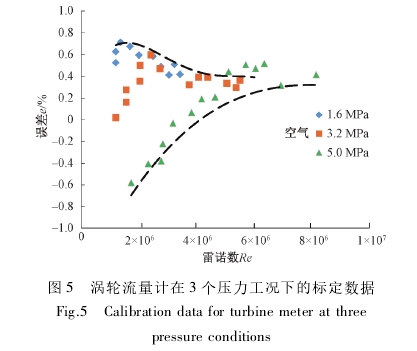 需(xū)要指出的是(shi),上述實驗是(shi)在流量計制(zhì)造商限定的(de)體積流量量(liàng)程内進行,僅(jin)在部分雷諾(nuò)數重疊區存(cún)在誤差的點(diǎn)對點比較,爲(wei)了擴大比較(jiao)範圍,有必要(yao)将标定實驗(yàn)拓展到流量(liàng)計量程的下(xia)限以下。爲此(cǐ),在高壓空氣(qi)環道流量标(biao)準裝置的3個(gè)工況(1.6.3.2.5.0MPa)下對一(yi)台DN150的渦輪流(liu)量計進行多(duo)點标定,結果(guo)如圖5所示。