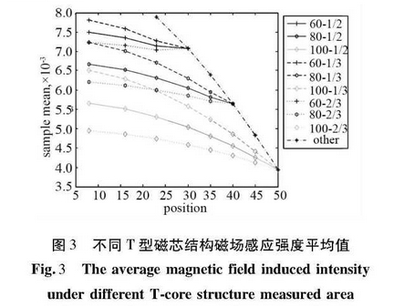 如圖3所(suǒ)示爲不(bu)同T型磁(ci)芯結構(gou)下測量(liang)區域産(chǎn)生磁場(chang)感應強(qiang)度平均(jun)值,圖中(zhong)橫坐标(biao)爲T型磁(cí)芯b的角(jiǎo)度,縱坐(zuo)标爲測(ce)量區域(yù)的平均(jun1)磁場強(qiáng)度,圖标(biāo)表示的(de)是T型磁(ci)芯的不(bú)同α的角(jiǎo)度以及(ji)磁芯長(zhang)端寬度(du)所占的(de)比例其(qí)中以“角(jiao)度-比例(li)”表示,例(lì)如30-1/2表示(shì)T型磁芯(xin)的🈲較長(zhang)端角度(dù)α爲30°,k1/(k1+k2)爲1/2時(shí)的測量(liang)區域中(zhōng)平均磁(ci)場強度(du)測量結(jié)果圖标(biāo)🥵Other爲T型磁(ci)芯較長(zhǎng)端的角(jiǎo)度α與較(jiao)🐇短端的(de)角度b相(xiàng)等(即爲(wei)23,30,35,40,45,50)時的流(liu)量計測(ce):量區域(yù)中的平(píng)均🈲磁場(chǎng)強度.從(cóng)仿真結(jié)🌈果可以(yǐ)看出:T型(xíng)磁芯💘的(de)較長端(duan)的角度(du)α越小,流(liu)量計測(ce)量區域(yù)中平均(jun)磁場強(qiáng)度越大(da);在T型磁(ci)芯的較(jiao)長端的(de)角度α一(yī)定時,T型(xíng)㊙️磁芯的(de)較🐇短端(duān)的角度(du)🈚b越小,流(liu)量計測(cè)量區域(yù)中平均(jun)磁場強(qiáng)度越大(dà);在T型磁(cí)芯的較(jiào)長端的(de)角度α與(yǔ)較短端(duan)的角🔞度(dù)b一定時(shi)✂️,T型磁芯(xin)的k1/(k1+k2)越小(xiǎo),在流量(liang)💘計測量(liang)區域中(zhong)平均磁(cí)場強度(du)越大.