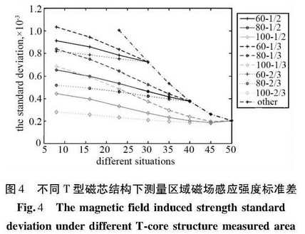 如(ru)圖4所示(shì)爲不同(tong)T型磁芯(xin)結構下(xia)測量區(qū)域産生(sheng)磁🏃🏻場🧑🏾🤝🧑🏼感(gǎn)應強🈲度(dù)标準差(chà),圖中橫(heng)坐标爲(wei)T型磁芯(xīn)b的角度(dù),縱坐标(biāo)爲測量(liang)區域磁(ci)場強度(dù)的标準(zhun)差,圖标(biao)圖例與(yǔ)圖3中一(yī)緻從仿(pang)真結果(guǒ)可以看(kàn)出:T型磁(cí)芯的較(jiao)長端的(de)角度α越(yuè)小,流量(liang)計測量(liàng)區域中(zhōng)磁場強(qiáng)度标準(zhǔn)👄差越大(da);在T型磁(cí)芯的較(jiào)長💃端的(de)角度α一(yī)定時,T型(xíng)磁芯🛀的(de)較短端(duān)的角度(du)b越小,流(liú)量計💔測(cè)量區域(yu)中磁👨❤️👨場(chang)強度标(biāo)準差😄越(yue)大;在T型(xíng)磁芯的(de)較長端(duān)的角度(du)α與較短(duan)端的角(jiǎo)度b一定(dìng)時,T型磁(cí)芯的k1/(k1+k2)越(yue)小,在流(liú)量計測(cè)量區域(yu)中磁場(chǎng)強度标(biao)準差越(yuè)大。