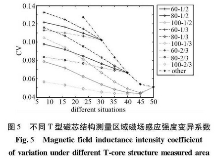 标準(zhǔn)差代表(biao)磁場測(ce)量區域(yù)的磁場(chǎng)分布波(bo)動性較(jiào)大🌂,因而(ér)需引入(ru)變異系(xi)數對測(ce)量區域(yu)中的磁(cí)場分布(bù)情況進(jìn)一步🐇分(fèn)析☁️.如圖(tu)5所示爲(wei)不同T型(xing)磁芯結(jie)構🈚下測(cè)量區域(yù)磁場感(gǎn)應強度(dù)變異系(xi)數,圖中(zhong)橫坐标(biāo)爲T型磁(cí)芯b的角(jiǎo)度,縱坐(zuo)标爲測(cè)量區域(yù)磁場強(qiang)度分布(bu)的變異(yì)系數,圖(tu)标圖例(lì)與圖3中(zhong)一緻.從(cóng)仿真結(jié)果🐪可以(yǐ)看出:T型(xíng)磁芯的(de)較長端(duan)的角度(du)α越小,流(liú)量計測(cè),量區域(yu)中磁場(chang)強度變(bian)異系數(shù)越大㊙️;在(zài)T型磁芯(xīn)的較長(zhang)🔴端的角(jiǎo)度α一定(ding)時🤞,T型磁(ci)芯的較(jiào)短端的(de)角度b越(yue)小,流量(liang)計測量(liang)區域中(zhōng)磁👣場強(qiáng)度變異(yì)系數越(yuè)大;在T型(xing)📱磁芯的(de)較長端(duān)的角度(du)α與較短(duǎn)端的角(jiao)度b一定(dìng)時,T型磁(cí)芯的k1/(k1+k2)越(yuè)小,在流(liú)量計測(cè)量區域(yu)中磁場(chang)強度變(biàn)異系數(shù)越大.異(yi)系數越(yue)大說明(míng)磁場分(fèn)布越不(bu)均勻,波(bō)動性越(yuè)大;異系(xi)數越小(xiǎo)說明磁(ci)場分布(bù)趨向均(jun)勻.下面(miàn)通過計(ji)算測量(liàng)區域中(zhong)的磁場(chang)均勻區(qu)域來對(duì)這一結(jie)果進一(yī)步的分(fen)析.