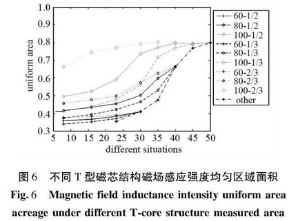 如圖(tú)6所示爲(wèi)不同T型(xing)磁芯結(jié)構下測(cè)量區域(yù)磁場感(gan)應強☎️度(dù)均勻✊區(qu)域面積(jī),圖中橫(heng)坐标爲(wei)T型磁芯(xin)b的角度(du),縱📐坐标(biao)爲測量(liang)區域磁(ci)場強度(dù)分布的(de)均勻區(qu)域👈面積(ji),圖标圖(tu)例與圖(tu)3中⁉️一緻(zhì).從✔️仿真(zhen)結果可(ke)以看出(chu):T型磁芯(xīn)的較長(zhang)端的角(jiǎo)度α爲越(yuè)🌈小,流量(liang)計測量(liàng)區域中(zhōng)磁場強(qiáng)度均勻(yun)區域面(mian)積越大(dà);在T型磁(cí)芯的較(jiào)長端的(de)角度α一(yi)定📐時,T型(xíng)磁芯的(de)較短端(duan)的角度(du)b越小,流(liú)🐕量計測(ce)量區域(yù)中🥵磁場(chǎng)強度均(jun1)勻區域(yu)面積越(yuè)大;在T型(xíng)磁芯的(de)較長端(duān)的角度(du)α與較短(duan)端的角(jiao)🈲度b一定(ding)時,T型磁(cí)芯的🌈k1/(h1+k2)越(yuè)小,在流(liú)量計測(cè)量區域(yù)中磁場(chang)強度均(jun)勻區域(yù)面積越(yuè)大.