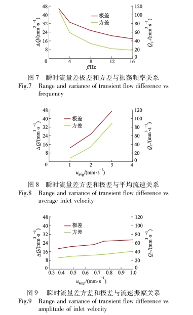 爲研究(jiū)人口流速各參數(shu)對瞬時流量差的(de)波動特性影響,對(duì)仿真記錄的瞬時(shí)流量差數據作方(fang)差分析和極差分(fèn)析,以此💜描述🔞瞬時(shí)流量差的波動情(qíng)況.瞬時流量差的(de)🏒極差和方差與振(zhèn)蕩頻率關系如圖(tu)💯7所示.當入口平均(jun1)流速和流速🆚振幅(fú)不變時,瞬時流🈲量(liang)差的極差和方差(cha)随人口流速的振(zhèn)蕩頻率增大而減(jiǎn)小也即人口流速(sù)頻率越大,瞬時流(liú)量差‼️的波動程度(du)越小,同時波動的(de)峰值也越小.