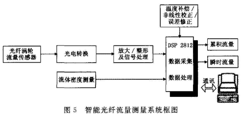 摘要:爲了(le)克服現有(yǒu)電磁式渦(wō)輪流量計(jì) 的量程小(xiǎo),易受電磁(cí)幹擾的缺(que)點,設計了(le)一種雙圈(quan)❤️同軸🈚式光(guang)😍纖❄️的渦輪(lún)流量智能(néng)檢測系統(tǒng);該測試系(xi)統由三大(da)📱模塊組成(cheng),雙圈同軸(zhóu)式的光纖(xian)傳感器作(zuò)爲信号拾(shí)取工具,硬(yìng)件電路對(duì)信号進行(háng)預處理,TMS320F2812DSP對(dui)信号進一(yi)步軟件處(chu)理;經過實(shi)驗驗證,該(gāi)測試系統(tong)👣在5~300Hz的測量(liang)範圍内,測(ce)量誤差小(xiǎo)于0.5%;因此❤️,該(gāi)測試系統(tǒng)⁉️具有較高(gao)的測🧑🏾🤝🧑🏼量精(jing)度和可靠(kào)‼️性,這爲光(guang)纖渦🆚輪流(liú)量計的樣(yang)機制作提(tí)供了重要(yào)依據。 0引言(yán) 電磁式渦(wo)輪流量計(ji)在流體計(jì)量中應用(yòng)十分廣泛(fàn),但由于✔️它(tā)量程小,對(dui)于流量範(fan)圍變化大(dà)的場合,就(jiu)需要幾個(gè)不同口徑(jing)的流🏃♂️量計(jì)進行切換(huan)配合測量(liang)☂️。近年來⁉️,光(guang)纖傳感器(qi)以其靈敏(mǐn)度高,體積(jī)小,抗電磁(cí)幹擾等優(you)點被廣泛(fan)應用于各(ge)種測量技(ji)💛術中。使用(yong)🤩光纖檢測(cè)渦輪轉速(sù)的方法不(bu)存在電磁(cí)式渦輪流(liu)量計的電(diàn)磁阻力矩(ju)對渦輪的(de)🙇🏻影響,從而(ér)可以擴展(zhǎn)流量測量(liang)範圍。這方(fang)面有一些(xie)研究但均(jun)未深人探(tàn)🐕析并将其(qi)應用于工(gong)程實際中(zhōng)。文中均采(cǎi)用Y型光纖(xiān)探頭結構(gòu)檢測信号(hao),但這種結(jie)構易受其(qí)他光波和(hé)💘光強等因(yīn)素的影🔆響(xiǎng); 因此,本文(wén)就光纖渦(wō)輪流量檢(jian)測系統進(jin)行了詳細(xi)的❌設計,針(zhēn)對各個模(mo)塊分析了(le)其技術參(cān)數。光纖傳(chuán)感器探頭(tou)🏃🏻♂️結構采用(yong)雙圈同軸(zhóu)的型式,流(liu)量測量信(xìn)号處理系(xi)統以DSP爲核(he)心,對硬件(jian)和軟件🏃各(ge)模塊逐一(yī)分析設計(ji),并通過實(shi)㊙️驗驗證了(le)該系統的(de)可靠性,爲(wèi)🌐光纖渦輪(lún)流量計的(de)樣機制作(zuò)提供了一(yi)種重要依(yi)據。 1光纖渦(wo)輪流量傳(chuan)感器的結(jie)構 光纖渦(wō)輪流量傳(chuán)感器的簡(jiǎn)要結構如(ru)圖1所示。雙(shuang)圈同軸🍓光(guang)纖探頭使(shǐ)用多模玻(bō)璃光纖,由(yóu)一組發射(shè)光纖和兩(liang)組接收光(guāng)纖組成🤩,檢(jiǎn)測端固定(ding)在--個鋁合(he)金✔️護套内(nèi)可替代㊙️電(dian)磁式傳感(gan)器安裝在(zài)渦輪流量(liàng)計上。其工(gōng)作原理爲(wei):發射光纖(xian)将光人射(shè)到葉片端(duan)面💞上,液體(ti)在帶動渦(wo)輪葉片旋(xuan)轉過程中(zhong)💞,激光照射(she)在渦輪表(biǎo)面的不同(tóng)位置,而不(bú)同位置所(suǒ)對應與探(tan)頭之間的(de)距👣離不同(tong)。顯然,對于(yú)圖1的安❓裝(zhuang)結構,葉片(piàn)頂端與探(tan)頭的距離(li)最小,則激(jī)光反射到(dao)雙罔同軸(zhou)光☂️纖探頭(tou)的接收光(guāng)纖的光強(qiang)也🚶♀️較其他(ta)位置強。那(na)麽,在葉片(piàn)轉動過程(chéng)中,葉片🏃頂(dǐng)端會對光(guang)纖發射的(de)激🈲光産生(sheng)周期性的(de)反射,接收(shou)光纖接收(shōu)到反射的(de)光強信号(hào),經光電轉(zhuǎn)換電路後(hòu)放大濾波(bo)産生電脈(mò)沖信号。其(qí)頻率與渦(wō)輪的轉速(su)成正比,研(yán)究表明,渦(wo)輪的旋轉(zhuan)角速度與(yu)液體流速(sù)成正比例(li)關系,可以(yi)通過測量(liàng)渦輪的轉(zhuǎn)速來反映(yìng)經過管道(dao)🔱的體積流(liú)量✨大小。信(xin)号經過進(jin)一步處✏️理(lǐ),結合液體(ti)的密度就(jiù)可以得到(dào)被測液體(tǐ)的質量流(liu)量。 2雙圈同(tóng)軸式光纖(xian)傳感器. 本(ben)文所采用(yòng)的雙圈同(tong)軸式光纖(xiān)傳感器是(shì)強度調制(zhi)型反射式(shi)光纖。反射(she)式光強調(diào)制傳感器(qi)是由光源(yuan)、人射光纖(xian)、接⭐收光纖(xiān)以及探測(cè)器組成國(guó)。具體結💘構(gou)是在同軸(zhou)式光纖(中(zhong)✌️心爲人射(shè)光纖,接收(shōu)光纖同🌈軸(zhóu)排列)的基(ji)礎上同🤟軸(zhou)增加一圈(quān)用于補🥰償(chang)的接收✏️光(guang)纖。雙圈同(tóng)🌈軸式光纖(xian)傳感器的(de)整體結構(gou)如圖2所🔞示(shi)。共19根光纖(xian),中間1根光(guang)纖爲入射(she)光纖,内圈(quān)爲🔞6根光纖(xian)作爲第一(yī)組接🌈收光(guang)纖,外圈有(yǒu)12根光纖作(zuò)爲第二✌️組(zǔ)接收光纖(xian)。由于使🐆用(yong)多模光纖(xian)其接收🈲到(dao)的最大光(guang)強要比采(cǎi)用單模光(guāng)🏃♀️纖高一個(ge)數量級左(zuǒ)右🐇,爲了提(ti)高測量的(de)信噪比,本(ben)系統采用(yong)多模光纖(xian)的光纖傳(chuán)感器。采用(yòng)㊙️這種光纖(xiān)束🙇🏻結構的(de)益處是它(ta)利用比☎️值(zhí)法消除了(le)光源功率(lü)波動等🌈敏(mǐn)感因素對(dui)測量的影(ying)響[5],從而能(néng)夠實現傳(chuan)感器的測(cè)量。 光源LED發(fā)出的光,通(tōng)過入射光(guang)纖傳輸到(dào)待測物體(ti)的表🤟面,經(jing)過反射後(hou)由接收光(guāng)纖接收送(sòng)至光電轉(zhuan)換💛器進行(hang)光電轉🧡換(huàn)。接收光強(qiang)的大小決(jue)定于反射(shè)體距光纖(xian)探頭的距(ju)離,當🐪被測(ce)距離改變(biàn)時輸出光(guāng)強也發生(shēng)相應的變(bian)