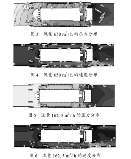 該(gai)次數值模(mo)拟流量爲(wèi)650,260,162.5,32m/h的情況,以(yi)下選取其(qi)中兩種情(qíng)況進💛行分(fen)析。如圖3和(hé)圖4所示,爲(wèi)流量650m³/h時的(de)z平面上的(de)壓力(Pa)和🌈速(sù)度(m/s)分布圖(tú)。從圖3可以(yi)明顯看出(chū)渦輪流量(liàng)計的💋壓力(li)損失主要(yao)集中在前(qian)後導流器(qì)和葉輪部(bù)分,而在其(qí)他部位的(de)壓力損失(shi)很小;速度(dù)分布圖☁️也(ye)很好地反(fǎn)映出渦輪(lun)流量計内(nei)部的流動(dong)情況。從👌流(liu)量.162.5m³/h時的壓(ya)力(Pa)和速度(dù)(m/s)分布圖,如(rú)圖5-6所示,可(kě)以得到相(xiàng)同的結論(lun),兩種🔞流量(liang)下㊙️,壓力和(hé)速度是相(xiàng)似的,但大(da)小有所不(bú)同。
