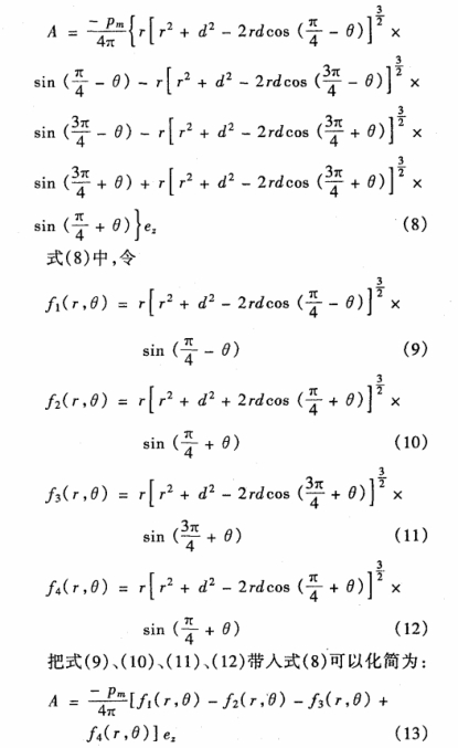 在柱(zhu)坐标系下求解(jie)四個磁偶極子(zǐ)在平面上的矢(shǐ)量磁👅位A的分布(bù)。在該平面上,任(ren)意一點的矢量(liang)磁位應該爲四(si)🌈個磁💞偶極子産(chan)生的矢量磁位(wei)疊加,即